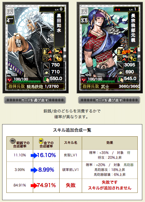 俺は長宗我部の追加スキル(槍隊剛撃と電光石火…)を剥がし、捨てスキルを付け、合成セットしてみた。
