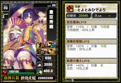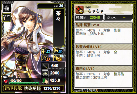 使い道がないのでここに入りました。もうちと育てて、狩野永徳同様3兵科対応軍師として運用したいが、初期スキルのせいでいずれにせよ代打要員の域を出ない。