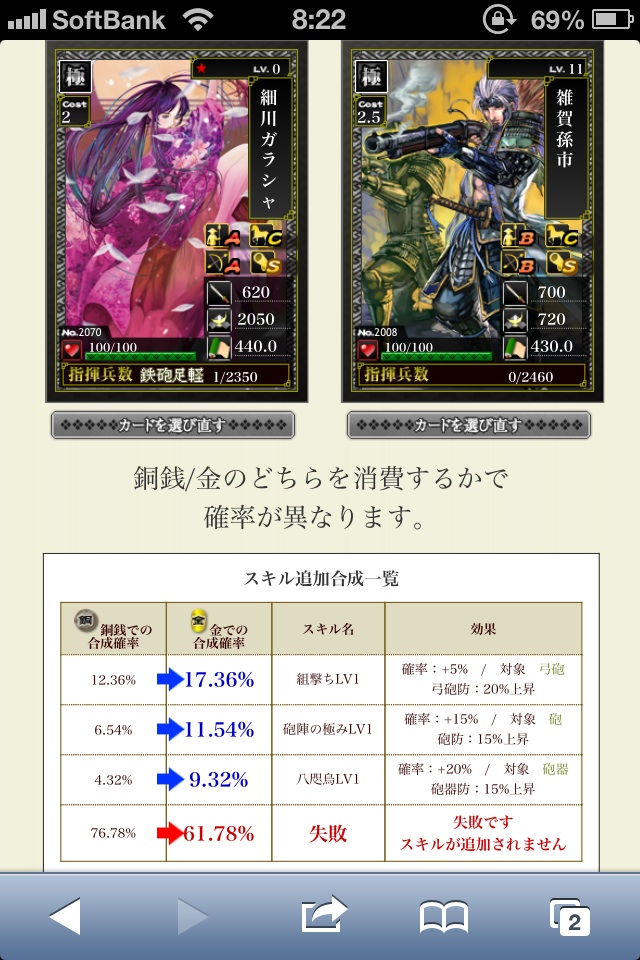 かれこれ6,7枚極を溶かしても旧天信長に砲陣羅刹が付かないので、諦めて土田御前の同カード合成でもしてみようかと。