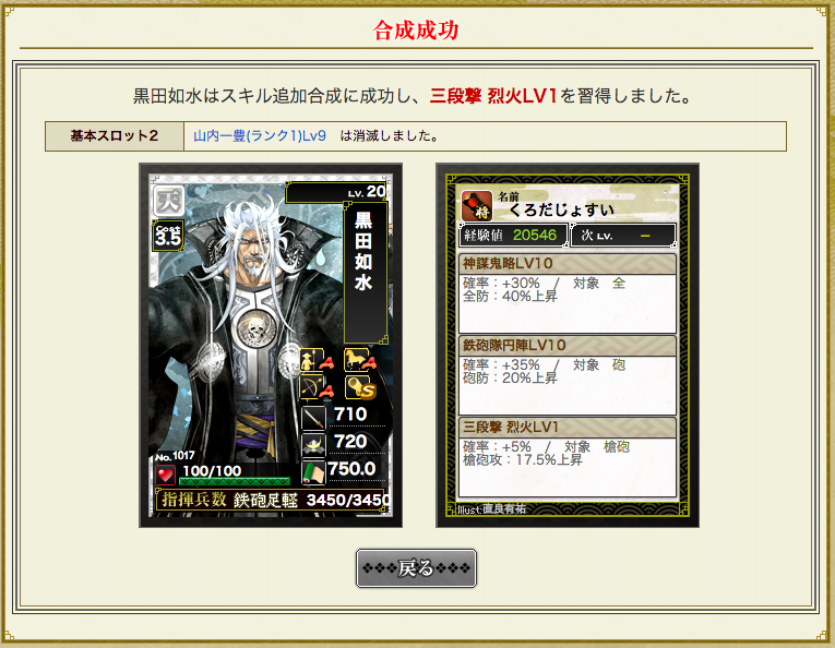 で、後回しになりがちな砲以外の防御スキルという性格上、戦陣千鳥合成にトライする人は多くないと思われます。