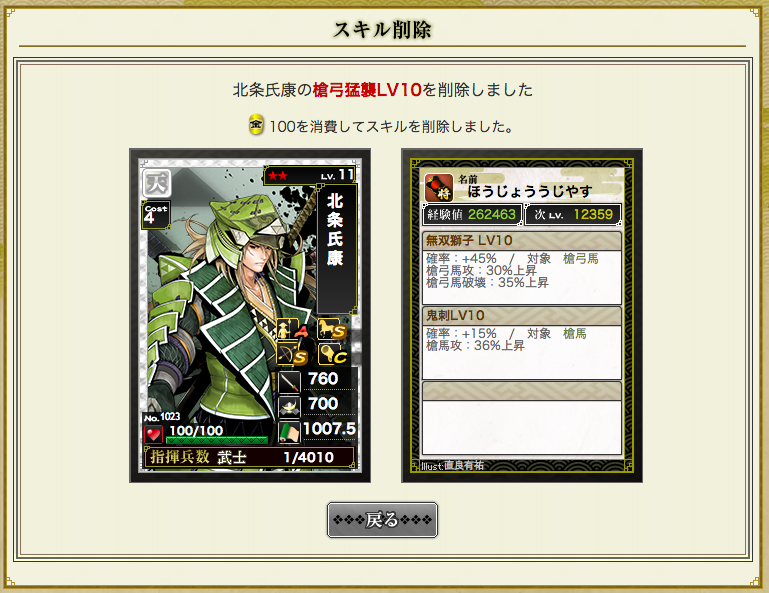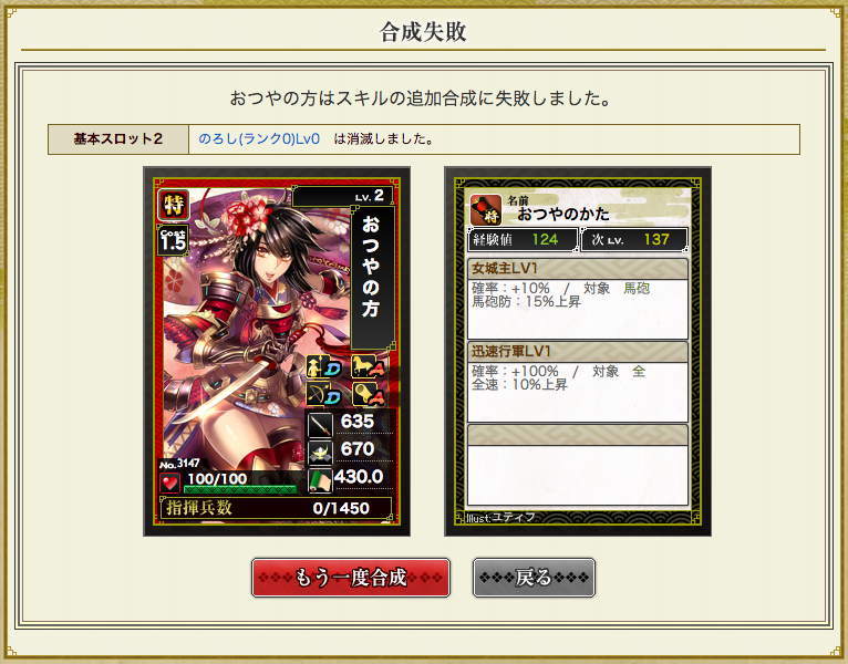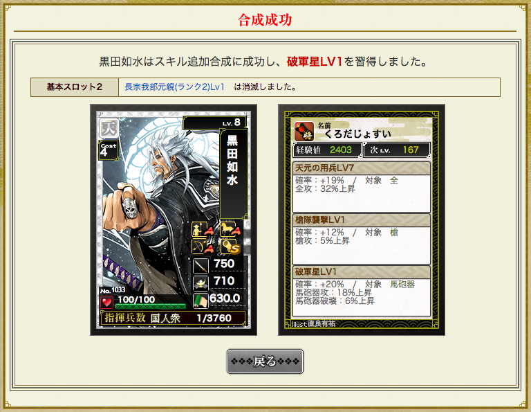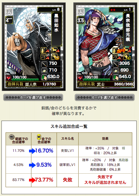 俺は長宗我部の追加スキル(槍隊剛撃と電光石火…)を剥がし、捨てスキルを付け、合成セットしてみた。