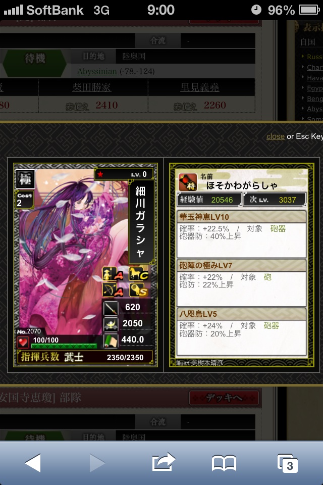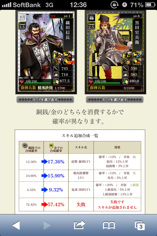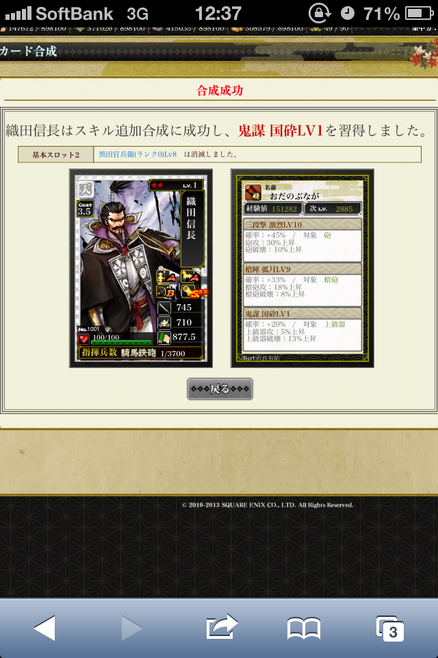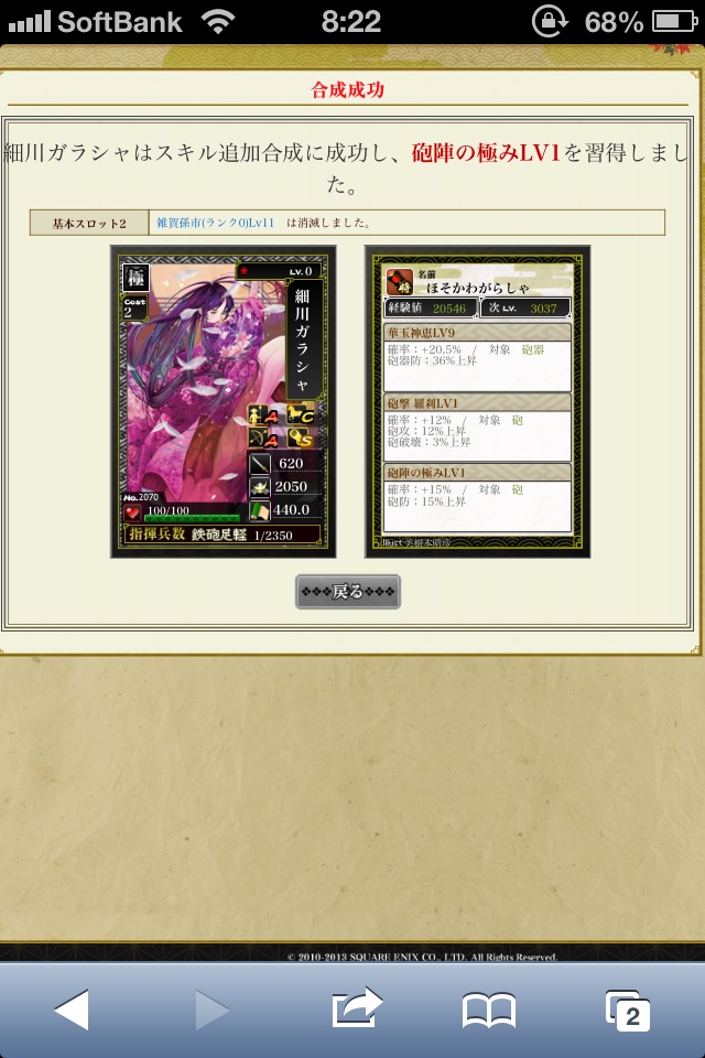 かれこれ6,7枚極を溶かしても旧天信長に砲陣羅刹が付かないので、諦めて土田御前の同カード合成でもしてみようかと。