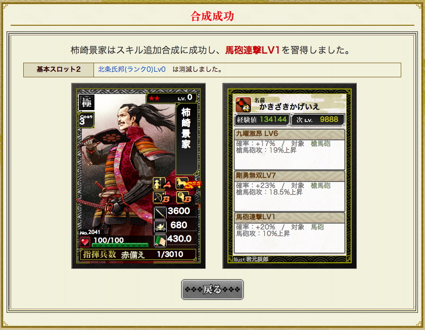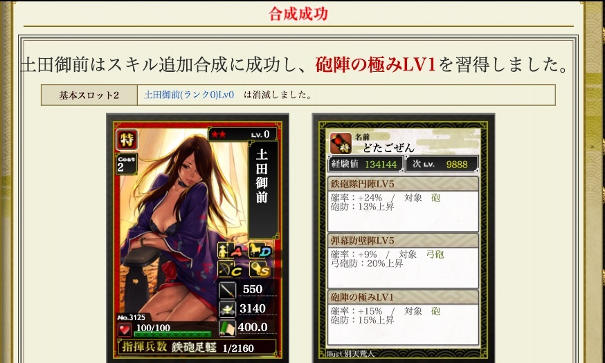 で、余ってた木村さんを合成したところ、槍陣孤月が一発成功!