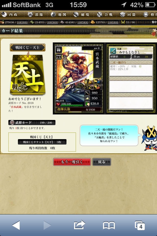 ランクアップ解放により、武将育成の意味合いが大きく変わったので、レベル上げ用に兵貯めないといけない状態で、合戦どころじゃありませんなw