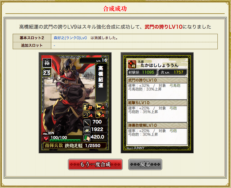 いつか素材に、と思っていた孫市を惜しげもなく投入し、一発で組撃ち追加成功。