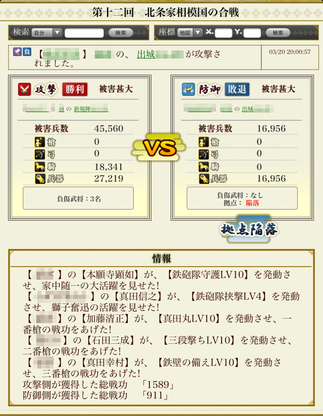 また、こちらは顕如の鉄砲隊守護を除けばスキルランク3のLv10以上のスキルしか表示されないわけですが、相手の攻撃スキルの表示の少なさを見ると、恐らくランク4の剛撃以上のスキルが大半だったと思われます。