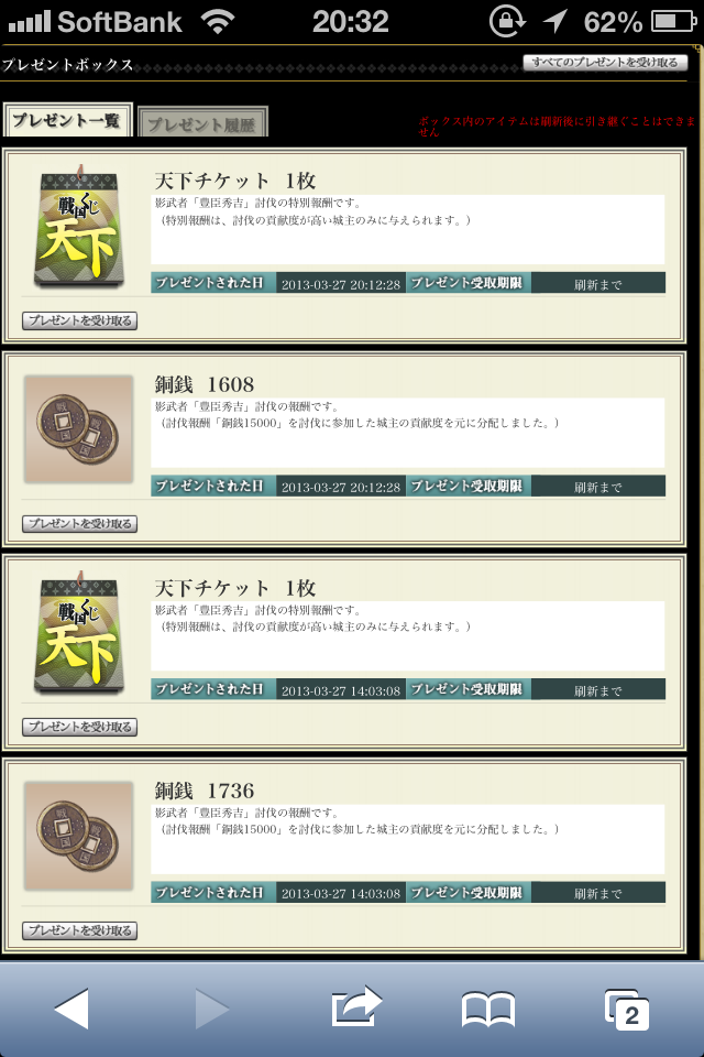 報酬という点だけで見れば、2日間張り付いて戦功3位以内に入っても炎3枚(しかも敗戦国は報酬なし)なのに、天影武者倒せば天下チケットというアンバランスさ。